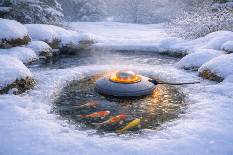 A pond heater keeps part of your pond ice-free in winter, supporting oxygen exchange, protecting fish health, and maintaining a safe, balanced pond environment.